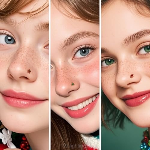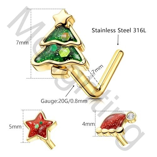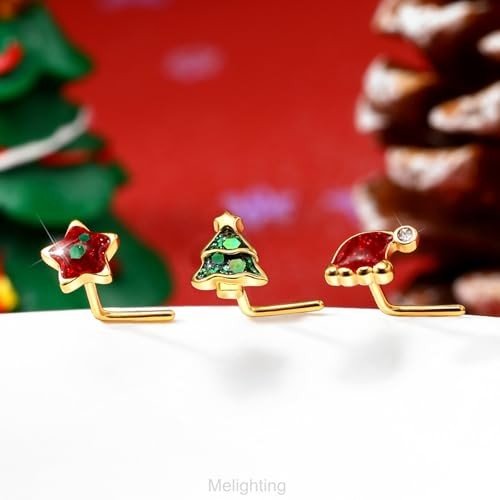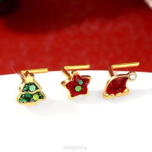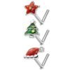 MeIighting 3PCS Christmas Nose Studs 20G Star Nose Rings 316L Stainless Steel Nose Piercing L-Shaped Christmas Tree Hat Nose Piercing Women 7mm-2